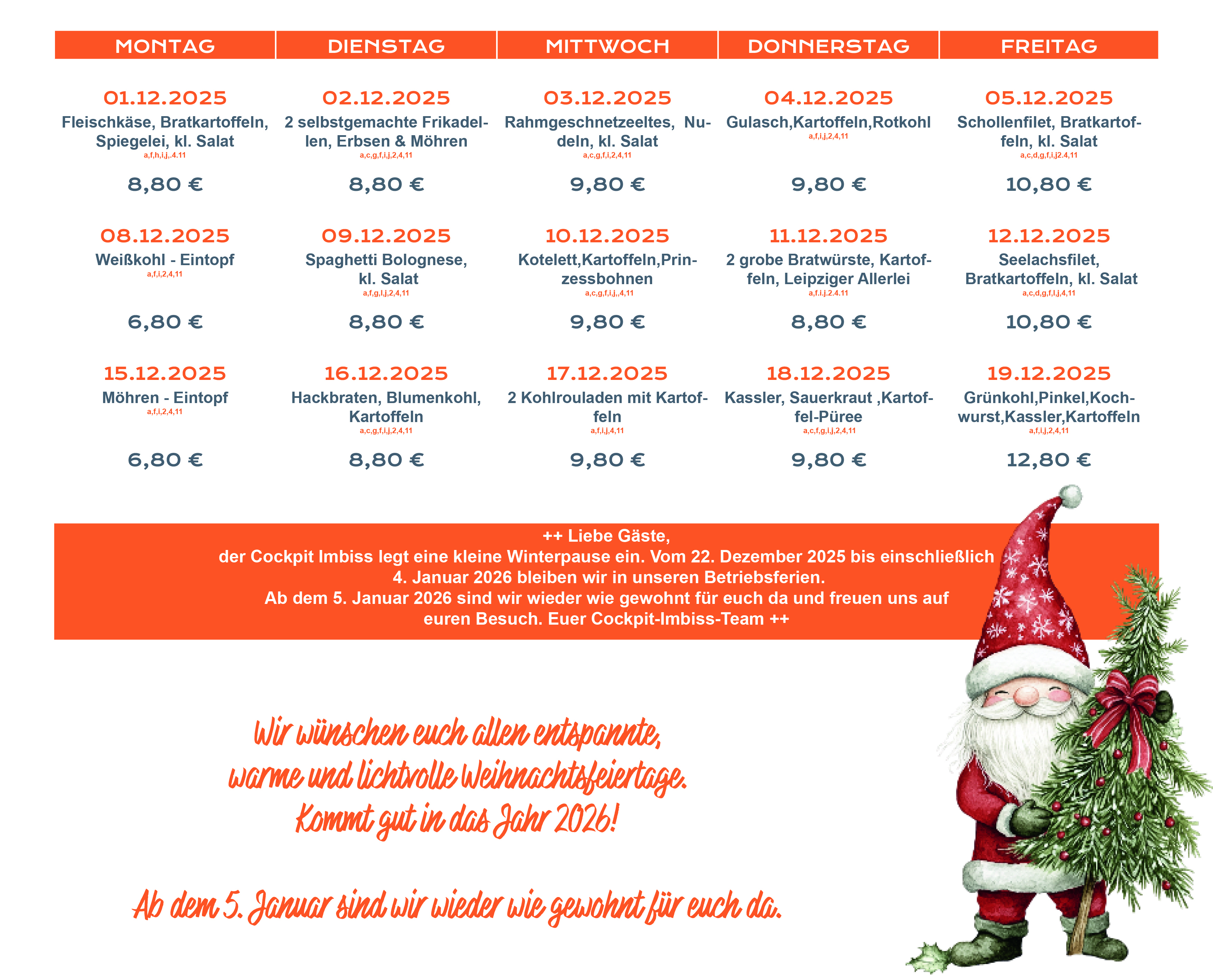 Unsere Speisen enthalten: a) Gluten b) Krebstier c) Eier d) Fisch e) Erdnüsse f) Sojabohnen g) Milch h) Schalenfrüchte i) Sellerie j) Senf k) Sesamsamen l) Schwefeldioxid und Sulfate m) Lupine n) Weichtiere